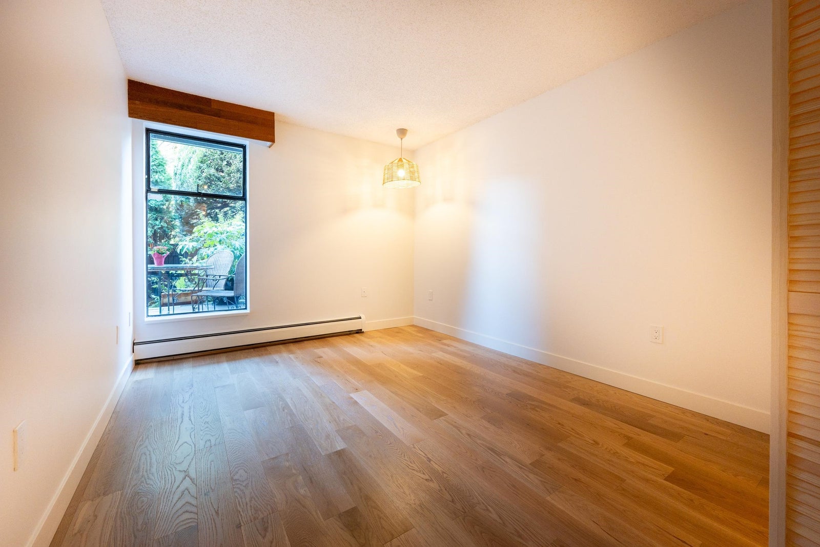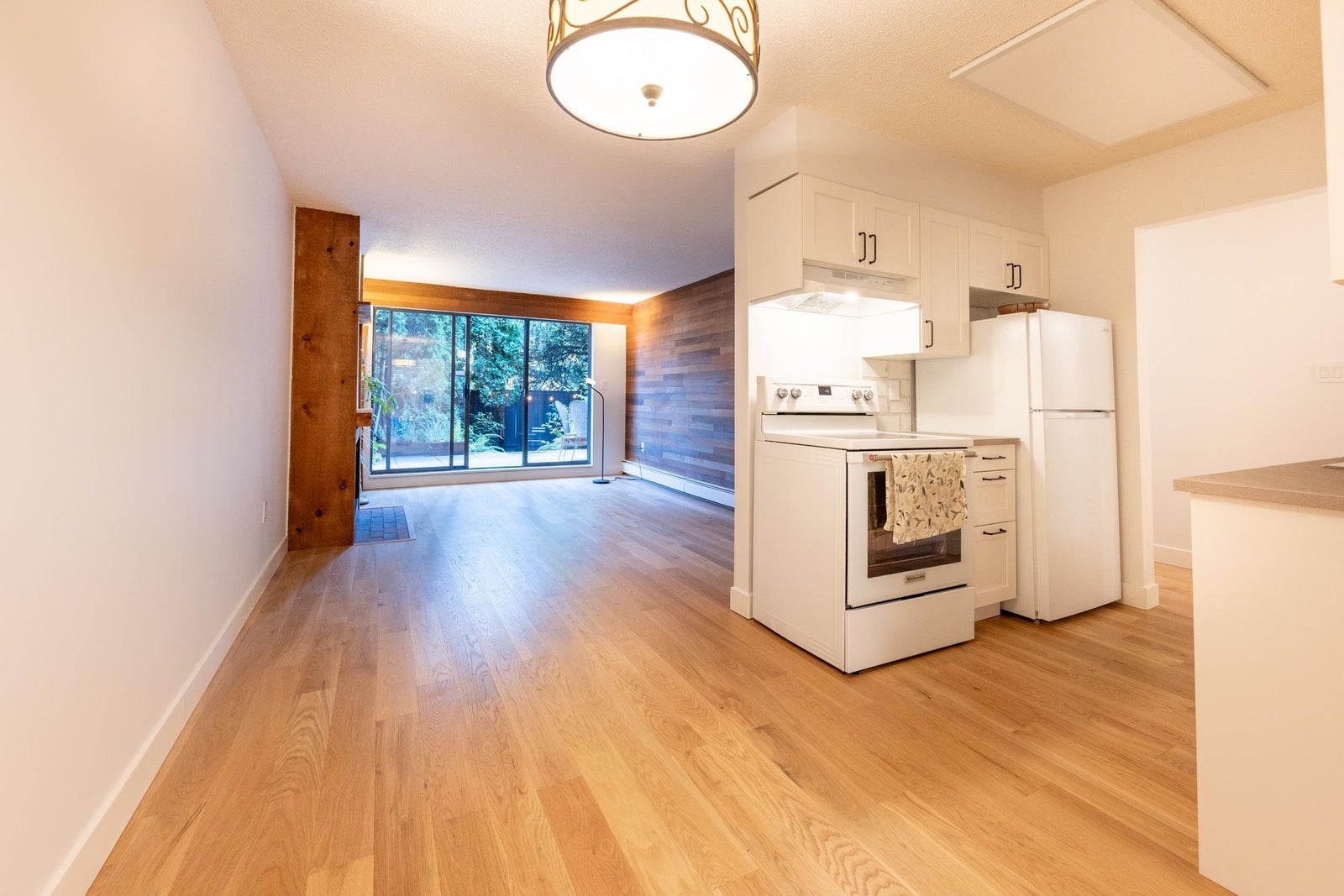 This one-bedroom residence opens onto a spacious, fully private backyard, framed by 5-metre-tall cedar trees that create a natural screen and peaceful retreat from city life. A partially covered patio opens into a terraced green space with river rock and extensive mature plantings. This is a remarkable space and quite a rare feature outside of single family homes or large townhouses.