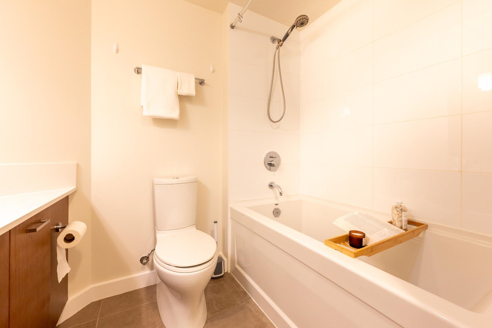 Residents have access to approximately 10,000 square feet of amenities, including a fitness centre, outdoor pool and hot tub, sauna, steam rooms, media and games lounges, children’s playroom, guest suite, and rooftop garden with an outdoor kitchen and BBQ area. A shared electric vehicle charger is available, and the building is Airbnb-friendly. One parking space is also included.